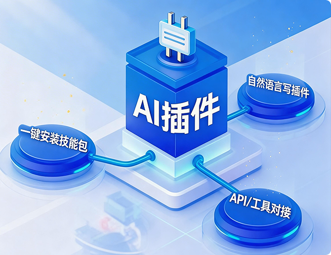 一键安装社区技能包,或用自然语言让 AI 自己写插件。 接入 API、对接工具链,能力边界由你定义。